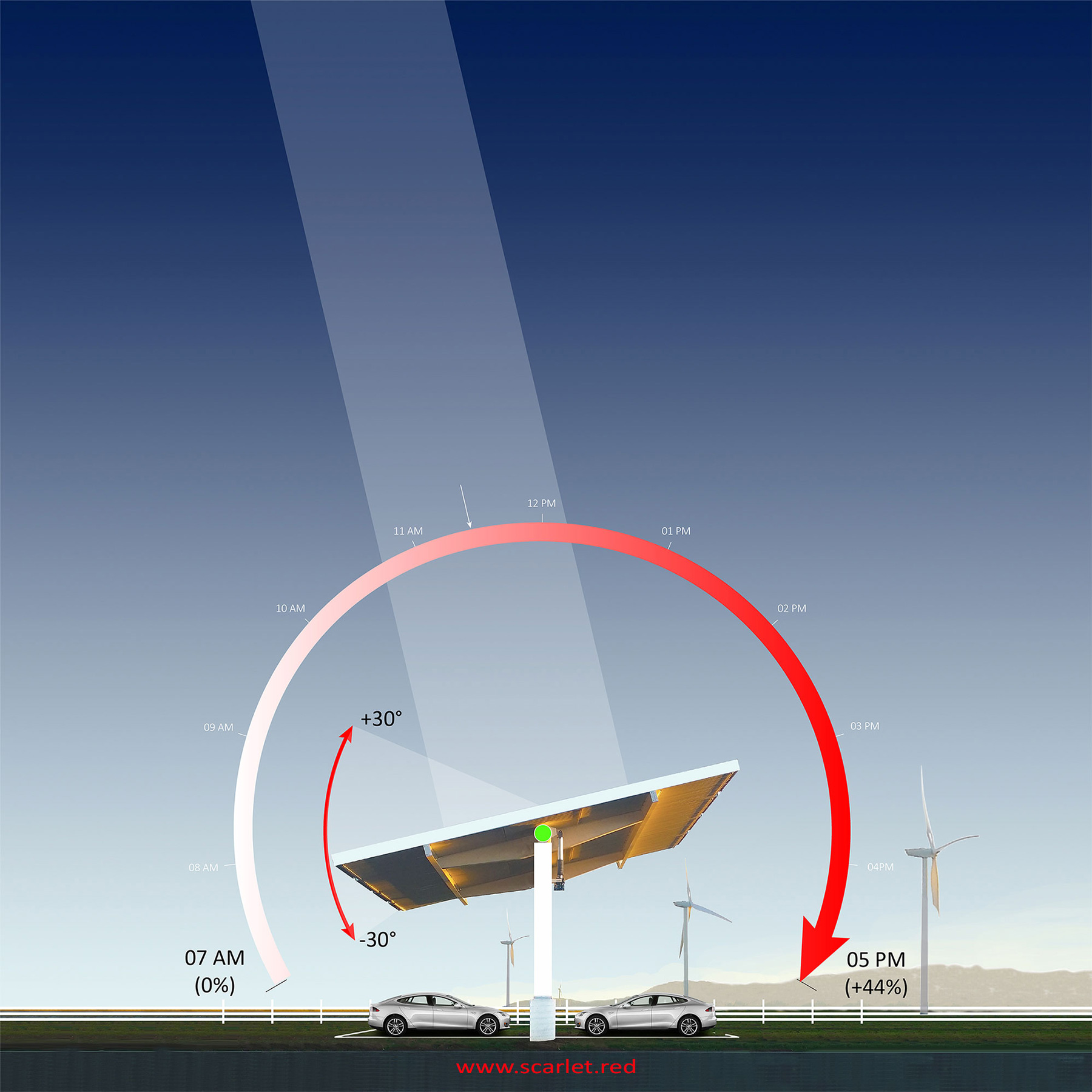 SCARLET TiltPort's solar roof tilts automatically: facing East in the morning, West at night, it produces up to 44% more energy and is far more profitable.