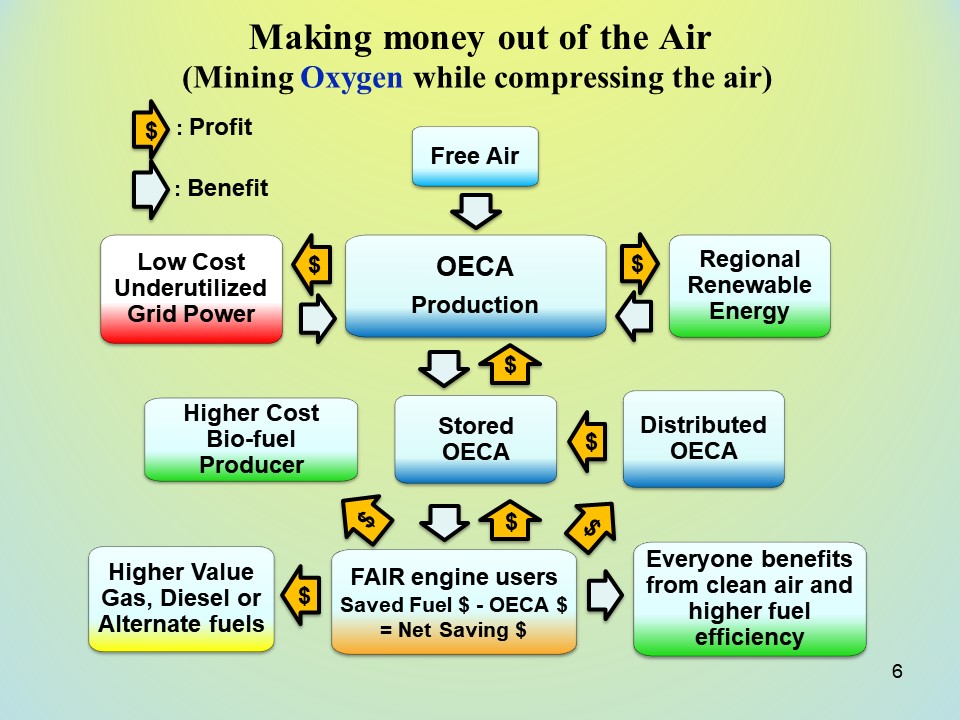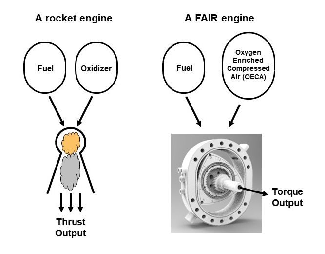 FAIR engine injects OECA (Oxygen Enriched Compressed Air) to enhance the combustion, it will lead to a quantum leap in fuel efficiency and clean emission.